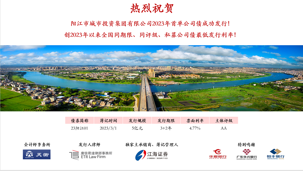 2023年3月1日,市城投集團(tuán)2023年面向?qū)I(yè)投資者非公開(kāi)發(fā)行公司債券在深圳證券交易所成功發(fā)行,規(guī)模5億元,期限5年(3+2年),票面利率4.77%,創(chuàng)2023年以來(lái)全國(guó)同期限、同評(píng)級(jí)私募公司債最低發(fā)行利率。這是市城投集團(tuán)繼去年在上海證券交易所成功發(fā)行公司債后,首次在深圳證券交易所成功發(fā)行公司債,融資渠道得到進(jìn)一步拓寬。