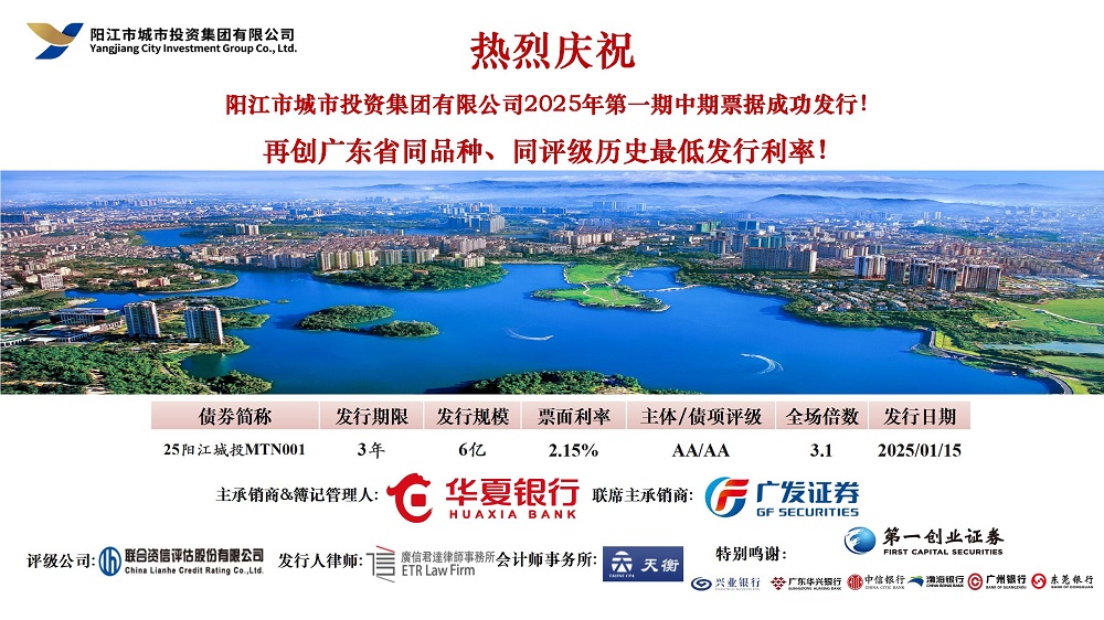 2025年1月15日,市城投集團在中國銀行間交易商協(xié)會成功發(fā)行“陽江市城市投資集團有限公司2025年第一期中期票據(jù)”。本期債券發(fā)行規(guī)模為6億元,期限為3年,票面利率2.15%,全場倍數(shù)超過3.1倍,合計申購機構(gòu)數(shù)23家。本期債券發(fā)行是市城投集團15億元中期票據(jù)的第二筆發(fā)行,承接上一筆成功發(fā)行的經(jīng)驗,在市委市政府關(guān)心關(guān)注和支持下,在市國資委等市直有關(guān)單位及中國銀行間交易商協(xié)會支持幫助下,本次債券再次創(chuàng)下了廣東省同期限、同評級債券近幾年歷史最低發(fā)行利率的紀錄。